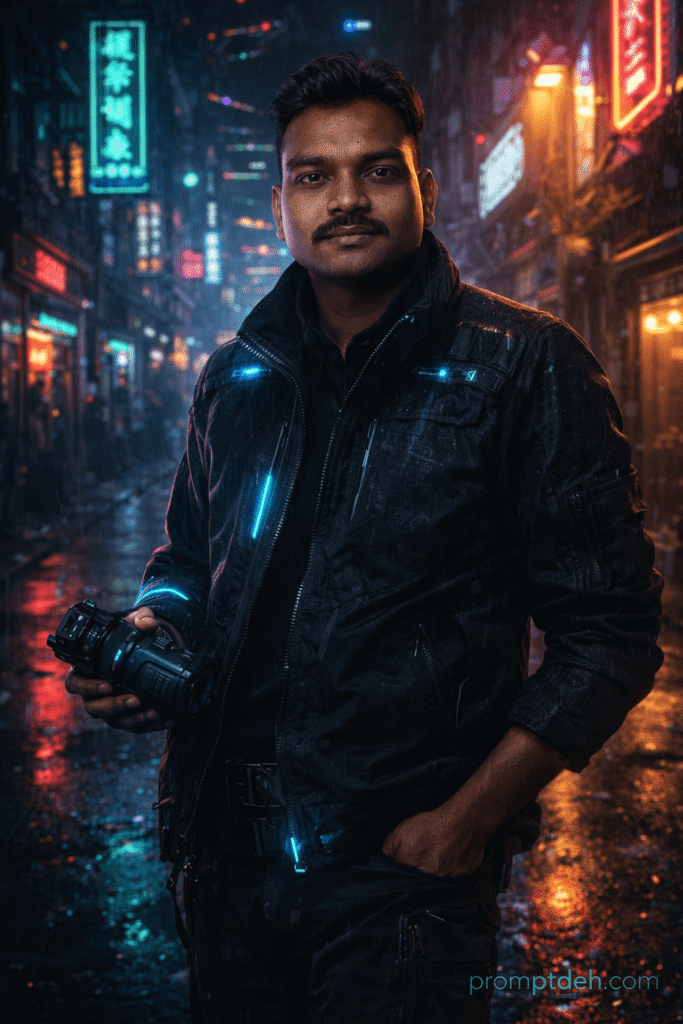 अगर आप चाहते हैं कि AI portrait में आपका face बिल्कुल same रहे और environment cinematic cyberpunk style में बदले, तो Face-Lock prompt writing बहुत जरूरी है।