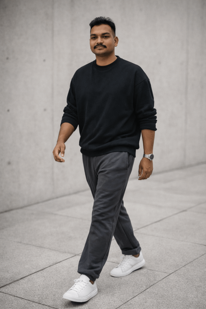 अपलोड की गई reference image के चेहरे को बिल्कुल वैसा ही रखें और उसमें किसी भी प्रकार का बदलाव न करें। चेहरे की बनावट, त्वचा की बनावट, मूंछ और प्राकृतिक facial features पूरी तरह सुरक्षित रहने चाहिए और किसी भी प्रकार का beauty filter या face smoothing इस्तेमाल नहीं होना चाहिए। यह image 1:1 square aspect ratio (DP size) या 4:5 vertical portrait format में बनाई जा सकती है। यह full-body candid photography style की image है जिसमें वही reference face दिखाई देता है और व्यक्ति minimalist concrete pavement पर चलते हुए दिखाई देता है। उसने classic black sweatshirt, well-fitted grey joggers और clean white minimalist sneakers पहने हुए हैं। मौसम हल्का बादलों वाला है और natural daylight पूरे scene को soft और realistic look देती है। चलते समय उसका expression focused और thoughtful है और वह कैमरे की ओर न देखकर थोड़ा side में देख रहा है जिससे candid photography जैसा natural feel आता है। पूरी image documentary style photography जैसी दिखाई देती है जो National Geographic photography style से प्रेरित है।