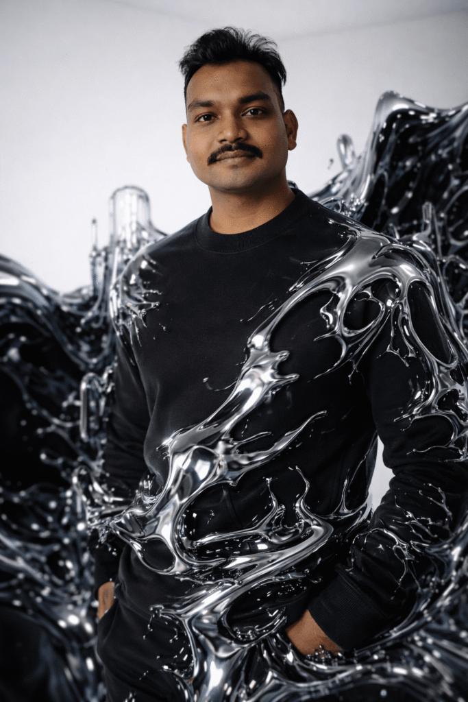 AI image generation tools की मदद से अब आप अपनी फोटो को बिल्कुल abstract liquid metal editorial portrait में बदल सकते हैं।