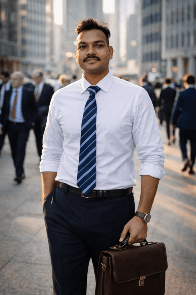 Urban lifestyle और corporate life को दिखाने वाली photos आजकल काफी popular हो गई हैं। खासकर morning commute style portraits जिनमें एक professional व्यक्ति शहर की भीड़ के बीच चलता हुआ दिखाई देता है, वे social media और professional branding के लिए बहुत पसंद किए जाते हैं।