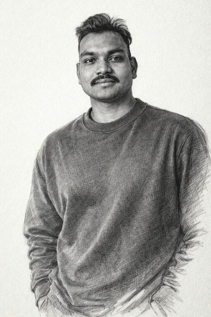 अपलोड की गई reference image के चेहरे को बिल्कुल वैसा ही रखें और उसमें किसी भी प्रकार का बदलाव न करें। चेहरे की बनावट, त्वचा की बनावट, स्किन पोर्स, मूंछ और चेहरे के प्राकृतिक features पूरी तरह सुरक्षित रहने चाहिए और किसी भी प्रकार का beauty filter या face reshaping नहीं होना चाहिए। यह एक artistic pencil sketch portrait है जिसमें वही reference face दिखाई देता है। व्यक्ति ने simple oversized sweatshirt पहना हुआ है। यह artwork ऐसा दिखाई देता है जैसे किसी professional artist ने graphite pencil से textured white paper पर बनाया हो। drawing में साफ दिखाई देने वाले pencil strokes, shading gradients और cross-hatching technique से shadows बनाए गए हैं जिससे portrait बहुत realistic hand-drawn style में दिखाई देता है। sweatshirt के fabric folds को sketch lines और soft shading के साथ carefully illustrate किया गया है। background clean white sketchbook paper है जिसमें हल्का paper grain texture दिखाई देता है। पूरी image ultra detailed pencil illustration style में है और dramatic shading के साथ high resolution fine art drawing जैसा look देती है।